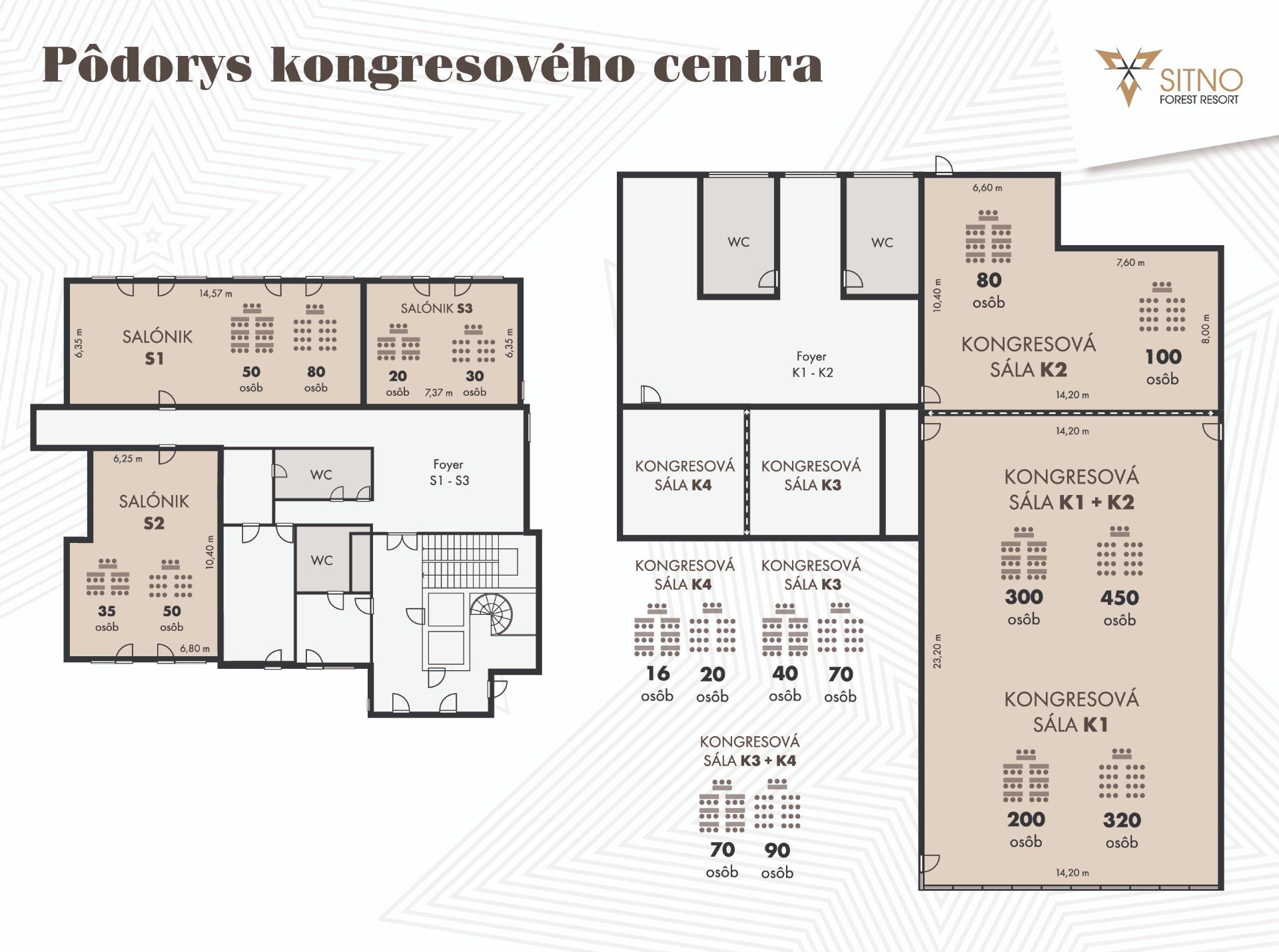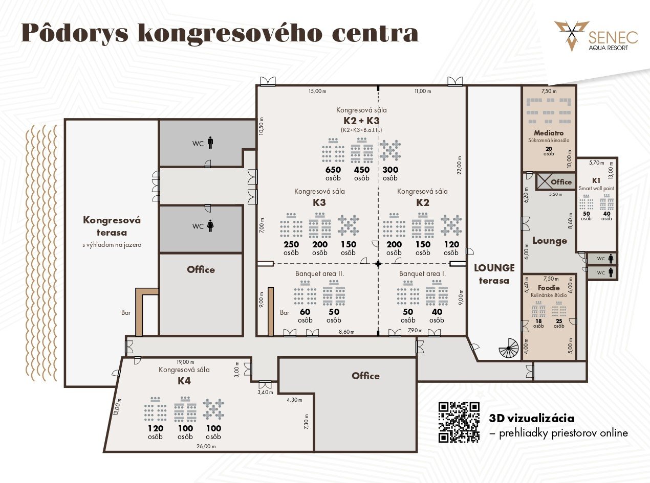 - Hlavná kongresová sála (K1 + K2): 450 osôb