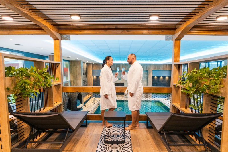 Vyhrievané vnútorné bazény s toboganmi a moderné wellness centrum pre dokonalý relax.